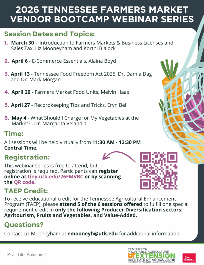 Producers participating in at least five (5) sessions per calendar year (January – December 2026) will fulfill one Tennessee Agricultural Enhancement Program (TAEP) Producer Diversification educational requirement for the following Producer Diversification sectors: Agritourism, Fruits and Vegetables, and Value-Added. Questions about TAEP should be directed to the TAEP Producer Diversification Coordinator at the Tennessee Department of Agriculture at producer.diversification@tn.gov. To receive credit, participants must either attend the live sessions or view recordings AND submit the evaluation/attendance for all sessions by December 31, 2026.